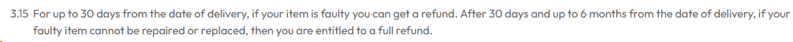 After 30 days and up to 6 months, if the faulty item cannot be repaired or replaced, you are entitled to a full refund.